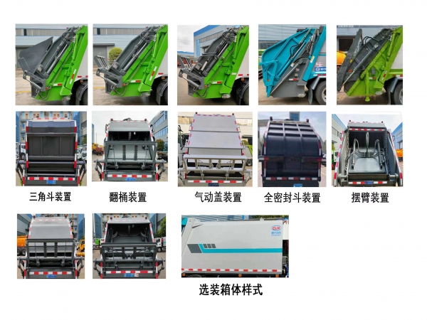 其它 | 1.專用裝置為垃圾箱體、卸料機構,主要用于收集、轉運垃圾作業(yè)功能;2.儲能裝置單體生產廠家/型號:力神動力電池系統(tǒng)有限公司/LP54173210-202Ah.儲能裝置總成生產廠家:力神動力電池系統(tǒng)有限公司;3.驅動電機類型為永磁同步電機,型號為TZ370XS-LKM1102,額定功率為80kw,峰值功率為160kw.ABS系統(tǒng)生產廠家/型號(西安正昌電子有限責任公司/ZQFB-V);4.側防護裝置材料為Q235,連接方式為螺栓連接.專用裝置代替后防護,離地高度為500mm;5.長度/前懸/后懸/后伸對應關系(mm):7750/1250/2300/400;7590/1250/2300/240;7570/1250/2300/220;7750/1200/2350/400;7590/1200/2350/240;7570/1200/2350/220;6.選裝直接供電式ETC車載裝置,選裝后部裝置樣式,選裝工作指示燈,僅在作業(yè)狀態(tài)下使用,行駛過程中不可點亮.選裝后部裝置及外觀樣式. | ||